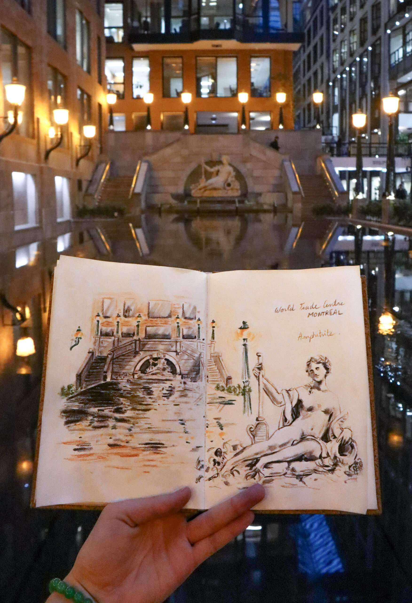 Mon premier croquis au Canada : le World Trade Centre avec son bassin miroir magnifique. Un refuge parfait pour fuir la chaleur étouffante d’un après-midi de juillet.